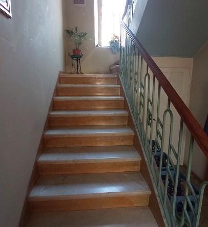 La scala di collegamento dei piani ha le pedate in travertino e le alzate in marmo; il parapetto ha un disegno geometrico in ferro battuto, con corrimano in noce.